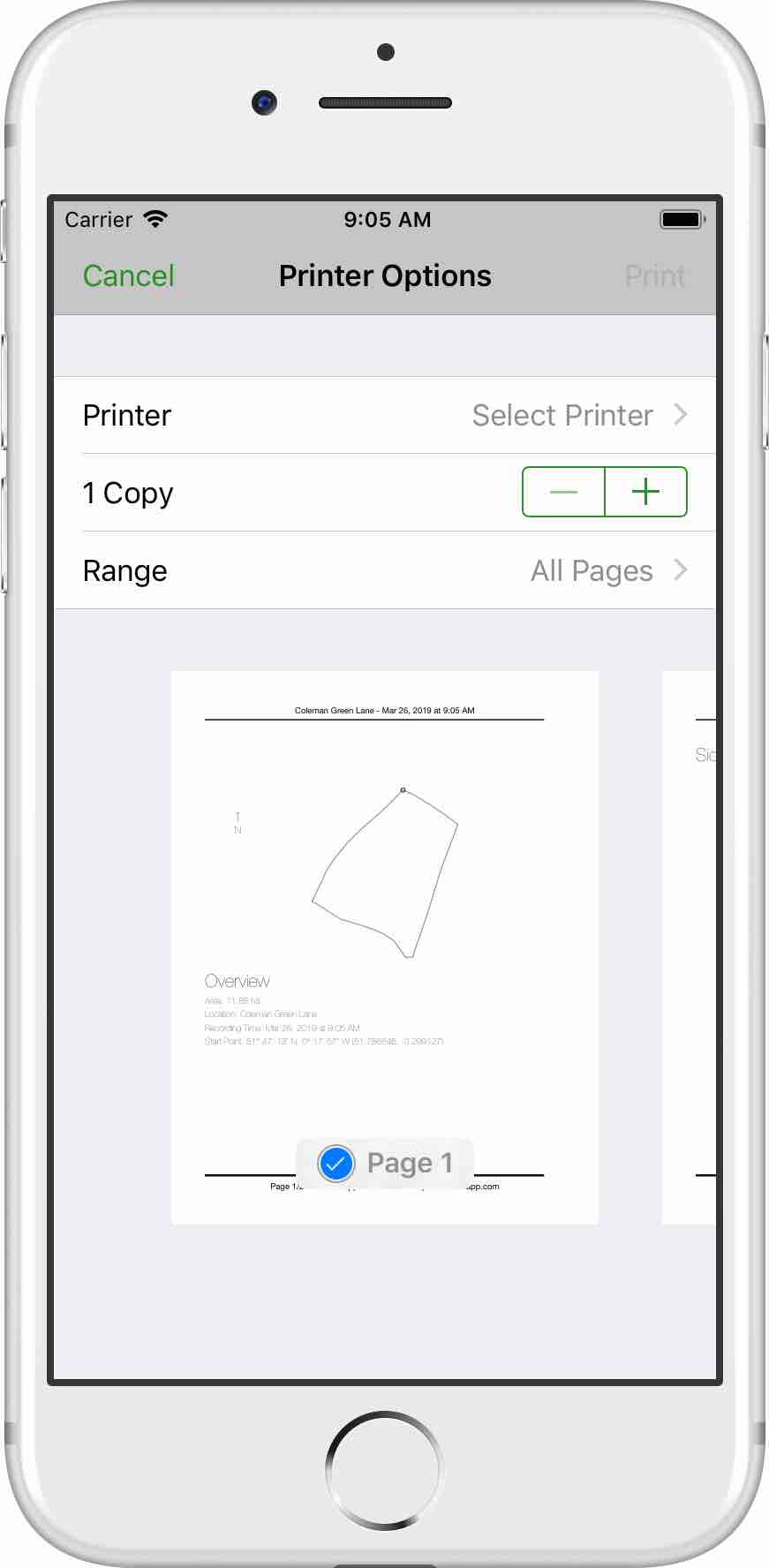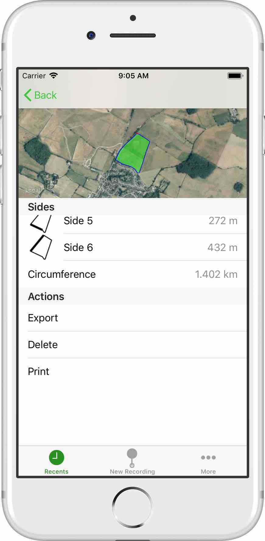 Two pages will be printed: The first page includes the map and shape of the recording as well as its details. The second page includes a list of all sides of the recording. The information contains the shape and location of the side as well as the length of the side.