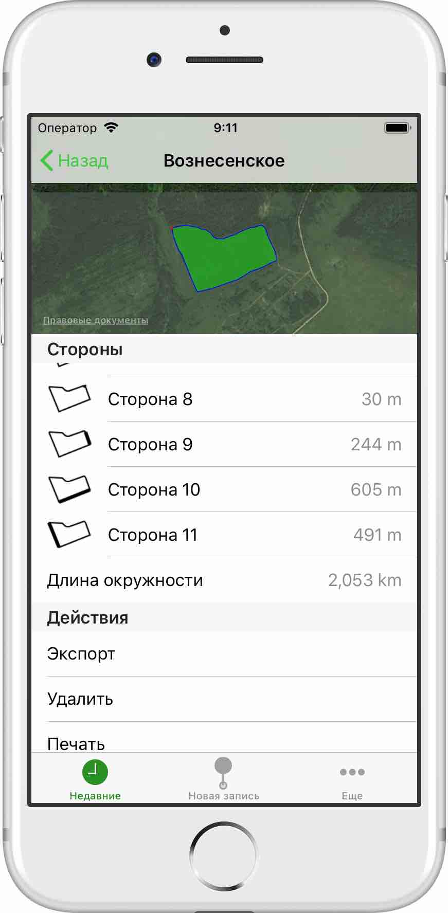 Two pages will be printed: The first page includes the map and shape of the recording as well as its details. The second page includes a list of all sides of the recording. The information contains the shape and location of the side as well as the length of the side.